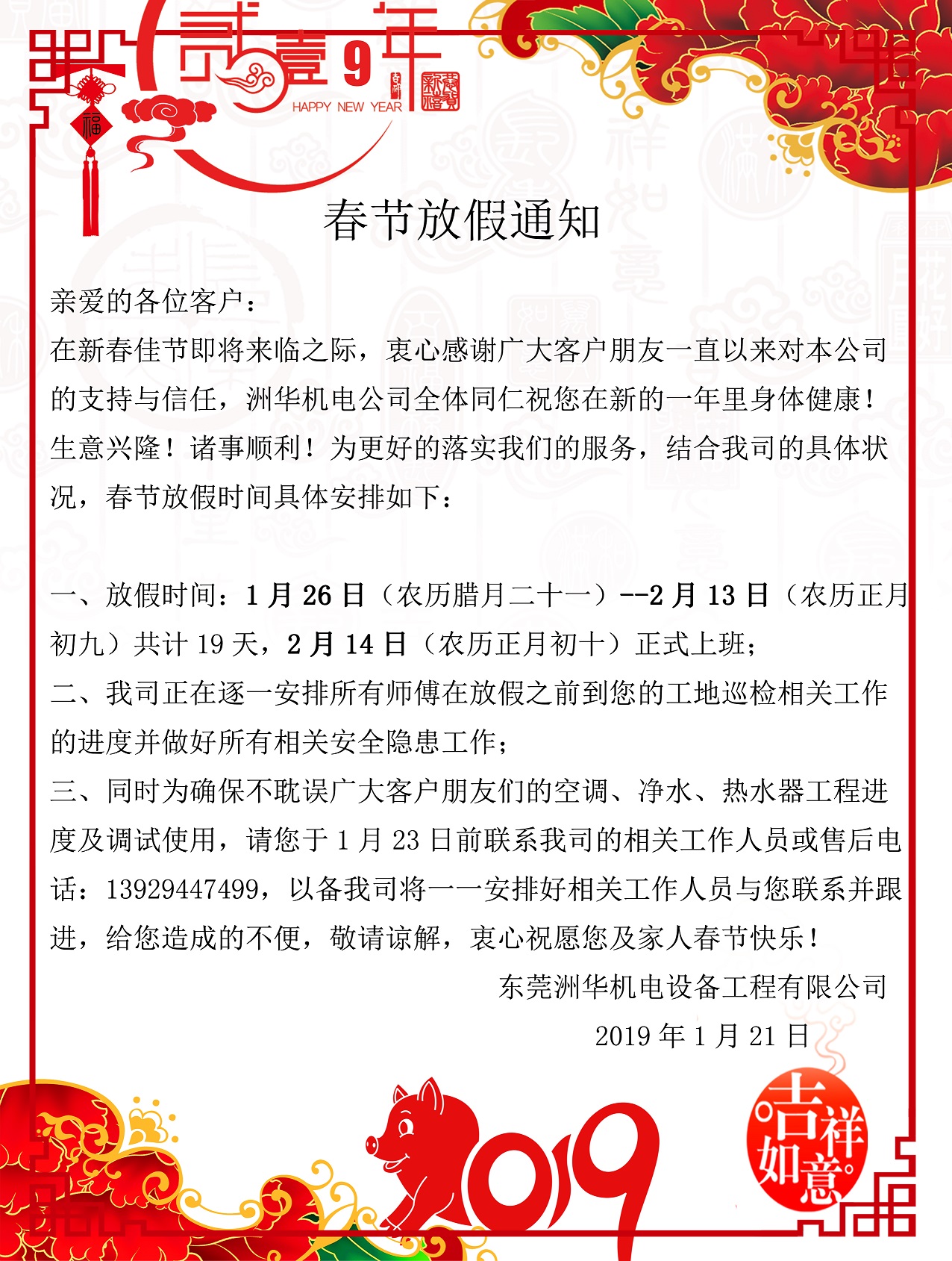 洲華機電2019春節放假通知